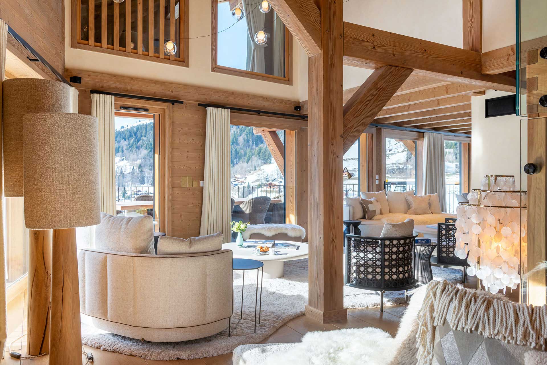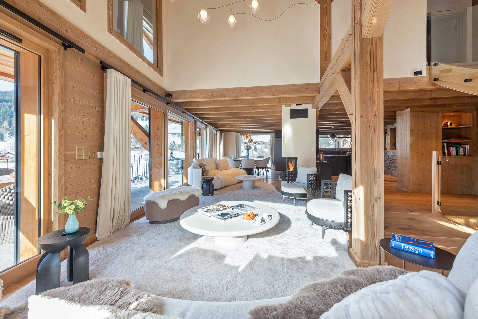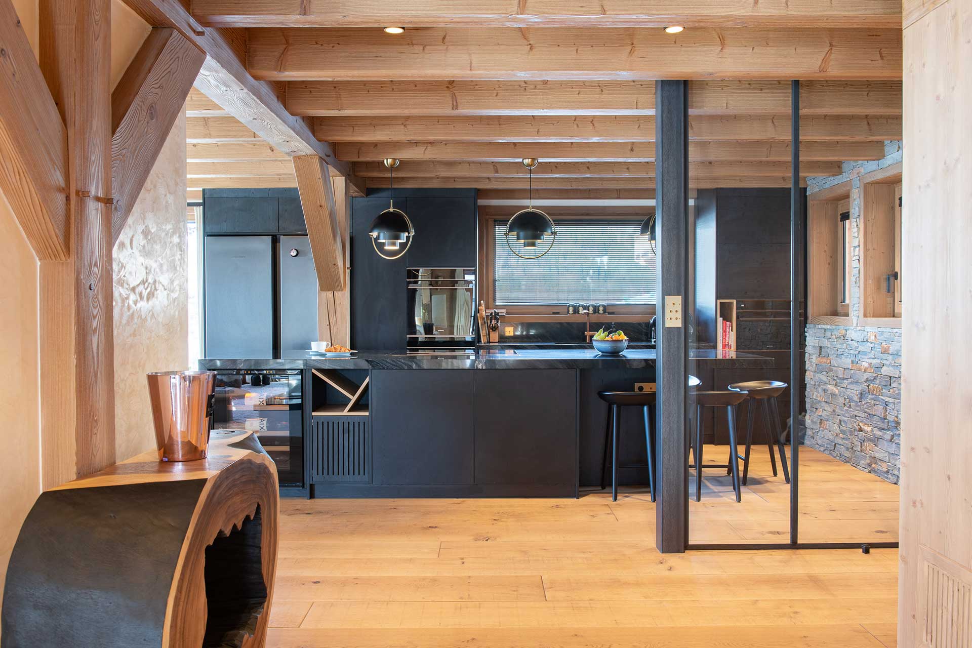 Some chalets have an immediate identity, an aura you can feel as soon as you step through the door, and that certainly applies to Chalet Avalon. The owners have obsessed over every detail, working with Devos Interieurs, a high end interior design studio based in Schilde in Belgium, to create a seamless and elegant home. For us, it’s a playful mix of both feminine and masculine touches and this balance makes it a really fun chalet to spend time in. The main living room has a softer feminine touch, with light coloured sofas, curving lines and layers of natural fabric finishes. It’s peaceful and refined, a very classy space. The main living level is open plan but well zoned around the central fireplace to create four distinct areas, the kitchen, dining room, primary lounge and a TV snug. All of this is tied together with a Bocci light installation featuring over 40 individual globes – a real statement piece.
