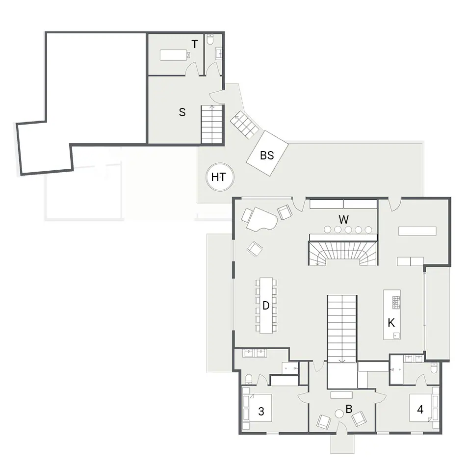 - Large terrace with hot tub (HT) and barrel sauna (BS)