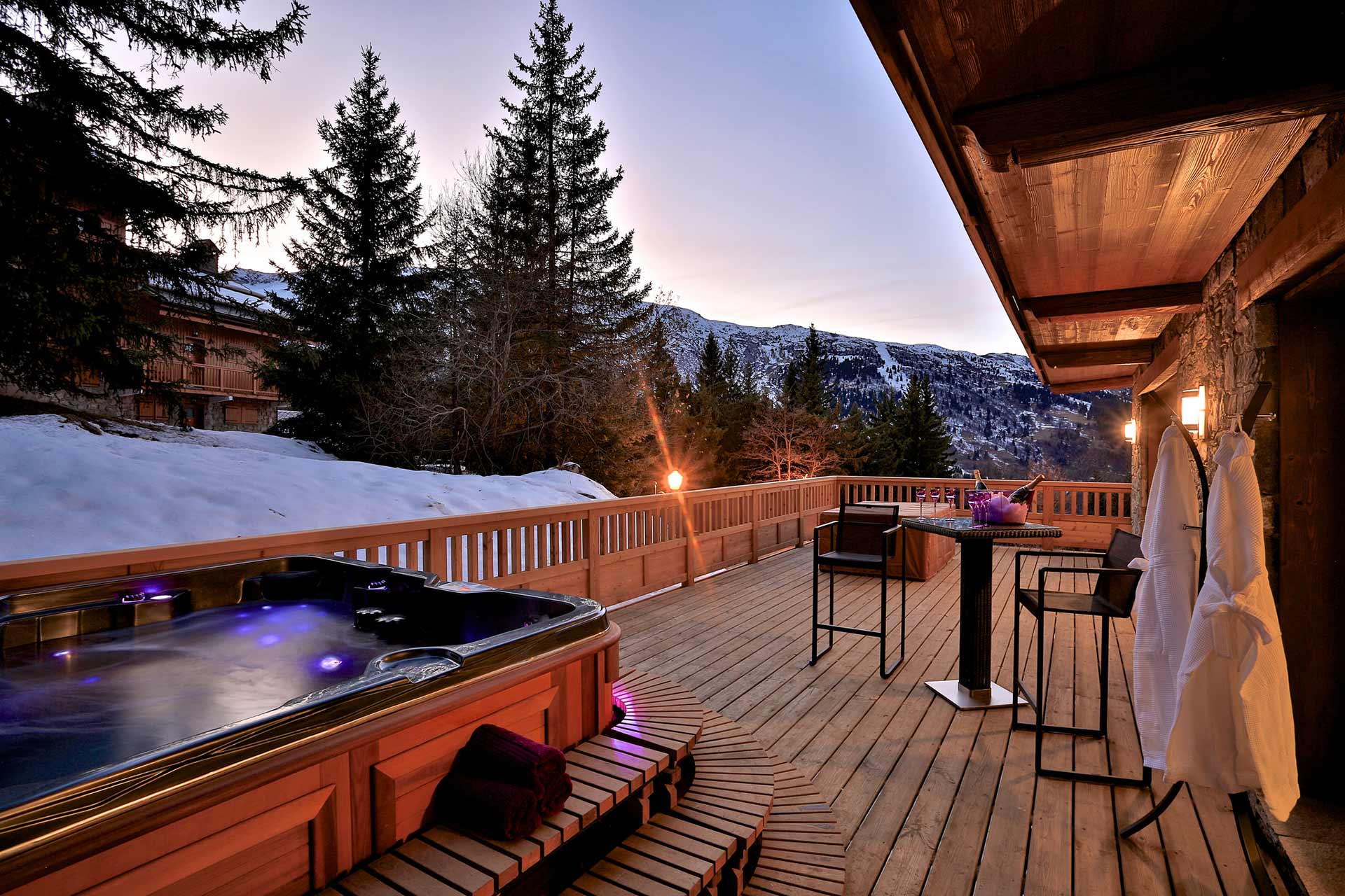The large southwest facing terrace sets the scene for glorious days and perfect nights. The large luxury 8-seater hot tub is perfectly positioned for you to enjoy incredible and world famous mountain views. Relax in the sunshine on the deck loungers or indulge in a glass of bubbles at the bar. The Wellness Suite includes a hammam, a private gym and your very own Bamford treatment room where you can indulge in Bamford’s botanic and organic treatments, facials and massages. If you still need to find your inner peace then why not sneak off to the private cinema and end the day watching one of your favourite films!